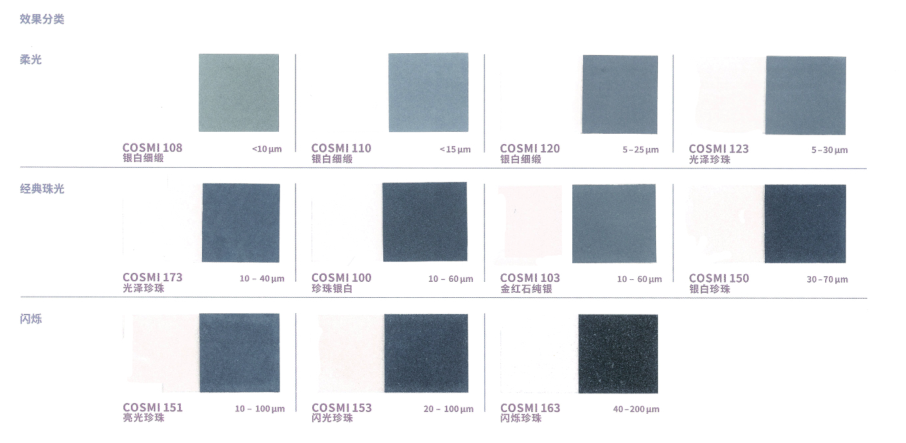 CosPearl 是我们以天然云母为基材的标准产品系列,色彩范围广,可应用于彩妆和个护产品。云母薄片包覆金属氧化物,如二氧化钛或氧化铁。通过光的折射、反射和干涉产生独特的光泽和色彩效果,包括银白色和彩色珠光,以及金色和闪烁的金属色效果。同时,虹彩系列也使依赖角度而变化的色彩设计成为可能。根据珠光颜料粒径的不同大小,效果从丝绒哑光到璀璨闪光不等。这就意味着粒径大小也会影响遮盖率,产品的粒径越细遮盖越好,反之,粒径越大遮盖就越透。此系列适合用于天然化妆品,能让成品具有典型的珠光效果。CosPear 易于混合,几乎可以为每一种应用增添闪亮和光泽。